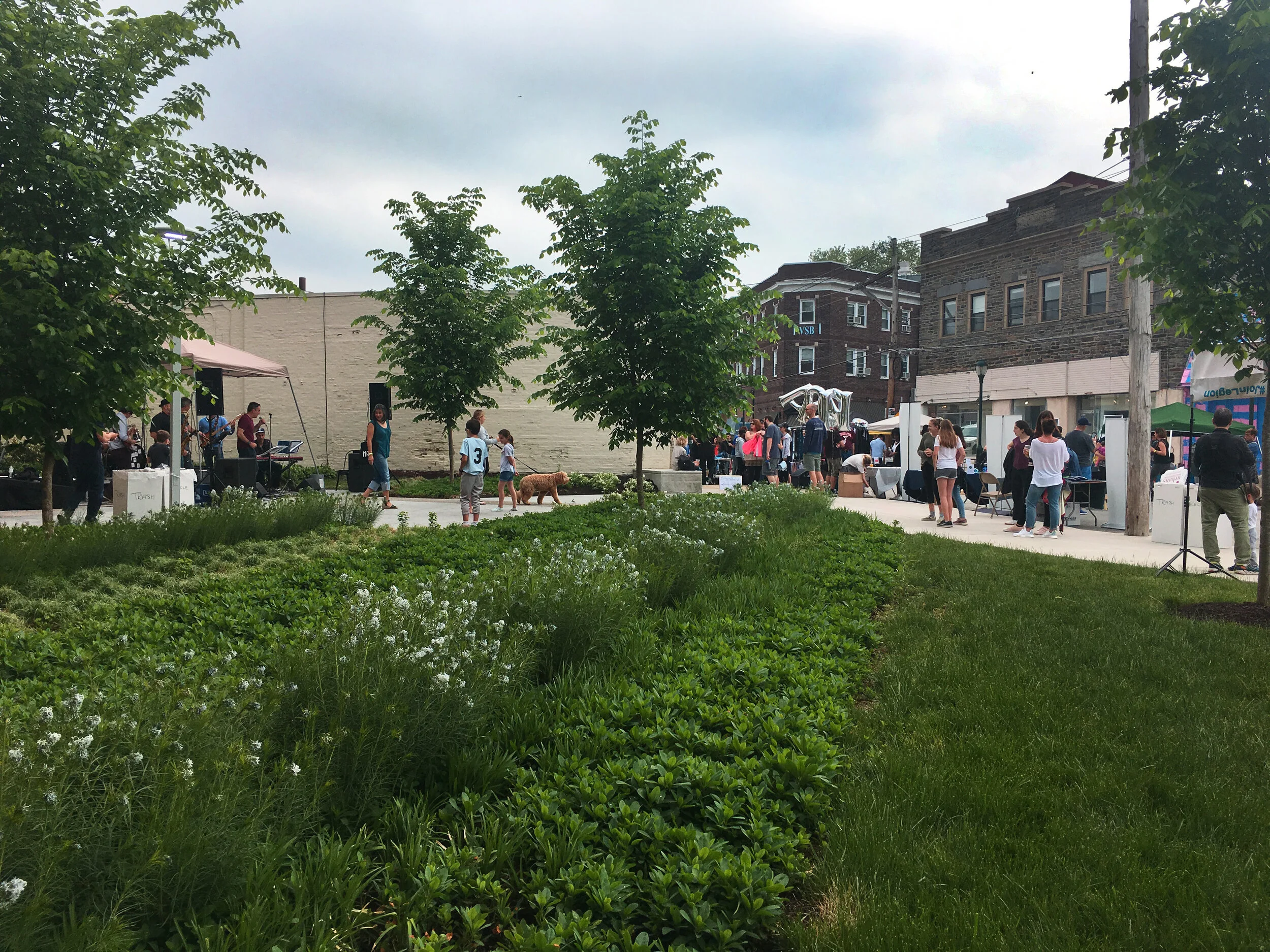 The new central plaza is framed by a textural diversity of perennials and shrubs and punctuated with four canopy trees, creating a garden oasis on busy Bala Avenue. The landscape creates an important visual green link between the nearby Cynwyd Heritage Trail, the Cynywd Regional Rail Train Station, and the historic Village of Bala. In addition, the plaza provides a new direct pedestrian access to retail shops from the adjacent public parking lot. Outdoor seating provides a boost for nearby cafes and shops, and helps to create a social anchor in this commercial area. The plaza hosts seasonal community events, such as the Bala Avenue Block Party and the Bala Avenue Arts Walk.